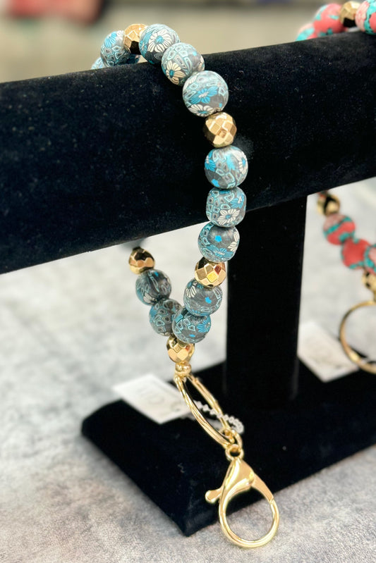 Floral Clay Beaded Bracelet Keychain- Choice of blue or coral.