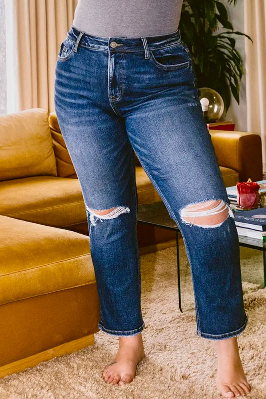 Plus Vintage High Rise Stretch Crop Straight Jean with Distressed Knees