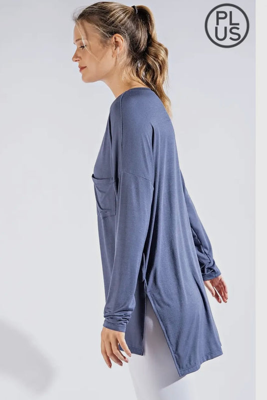 SALE! $15 Vintage Denim Plus Long Sleeve V Neck Top with Hi Low Hem