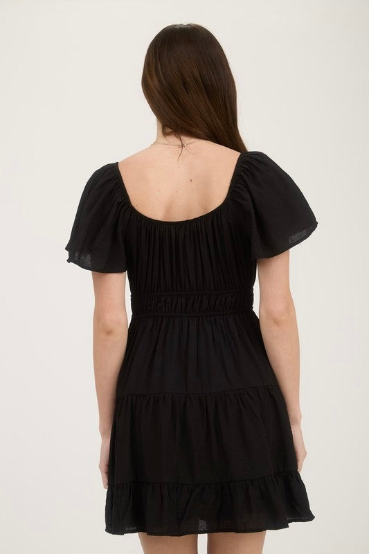 Black Linen Dress with Short Cuffed Sleeves and Frayed Hem