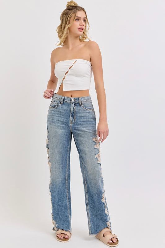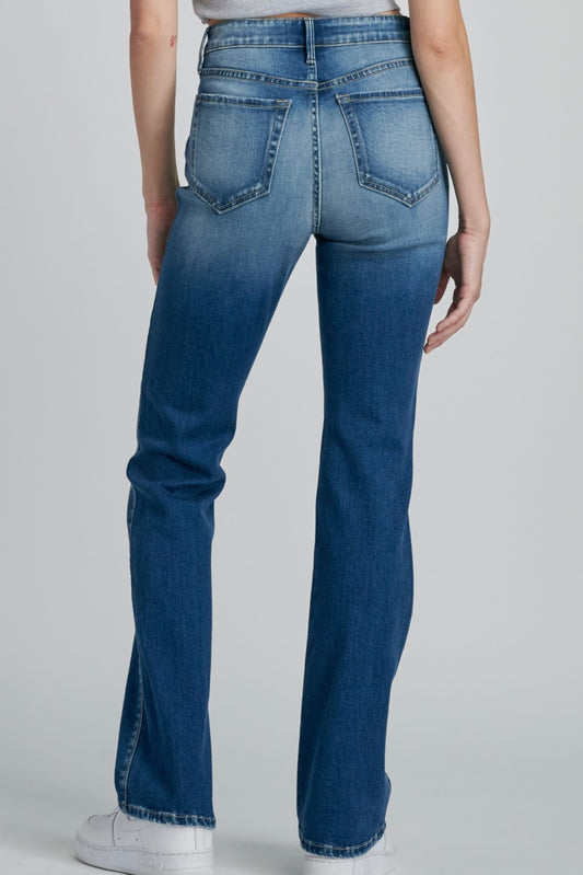 Cello High Rise Full Length Straight Leg Jean with Inseam Slit and Distressed Hem