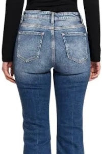 High Rise Super Stretch Kick Flare Distressed Jean in Dark Denim