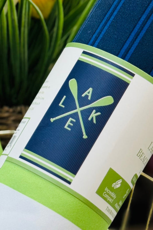 Lake Oar Microfiber Beach Towel in Navy, Lime Green, and White