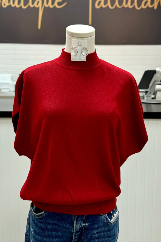 Red Mock Neck Short Dolman Sleeve Lightweight Sweater Top