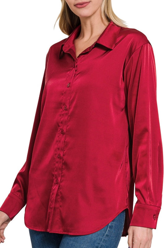 Burgundy Satin Button Down Blouse
