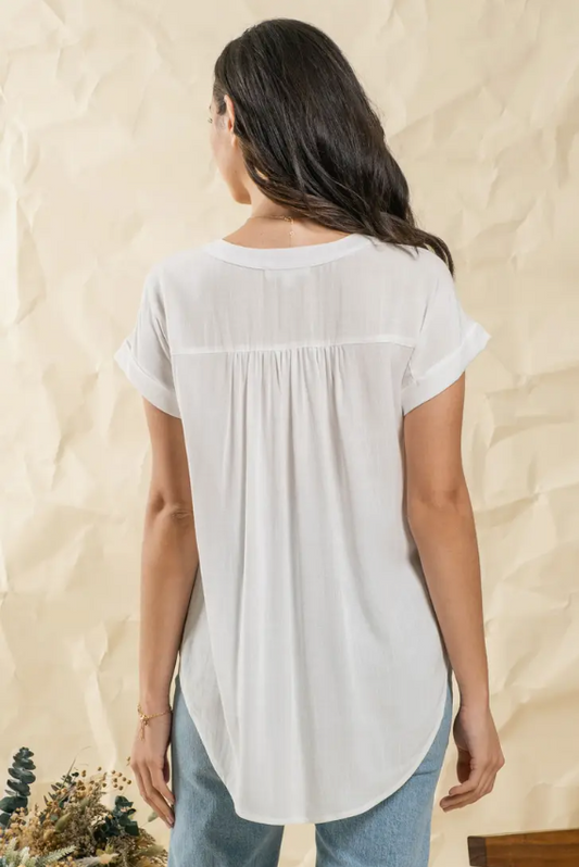 White Woven Top with Ruched Shoulder and Cuffed Sleeves