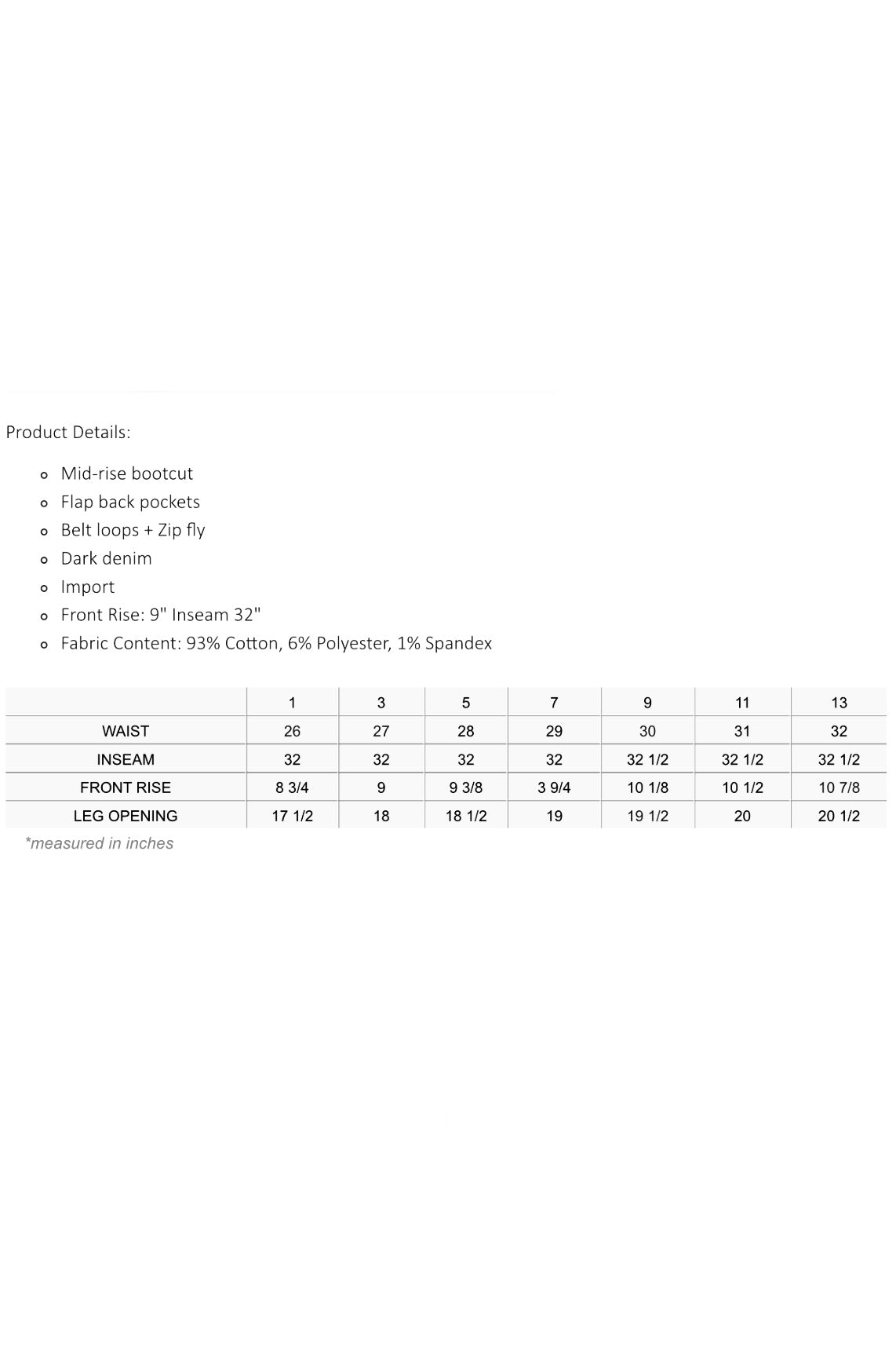 Cello Mid Rise Dark Wash Bootcut Jeans with Button Flap Back Pockets