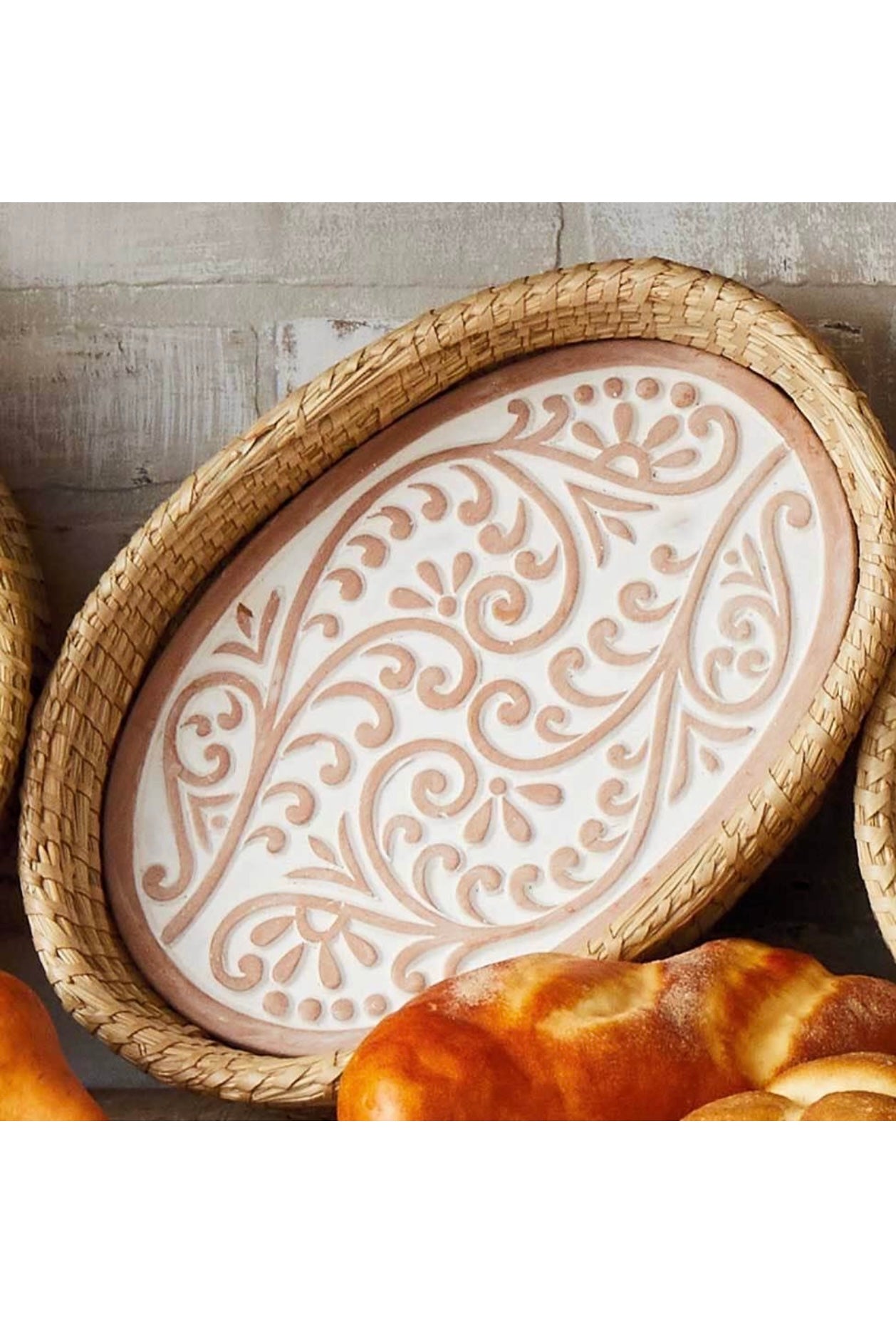 Whitewashed terracotta stone is deeply incised with a nature-inspired design and sits within a handwoven kaisa grass basket with palm wrap. Warmer is oven safe. A popular gift item!
