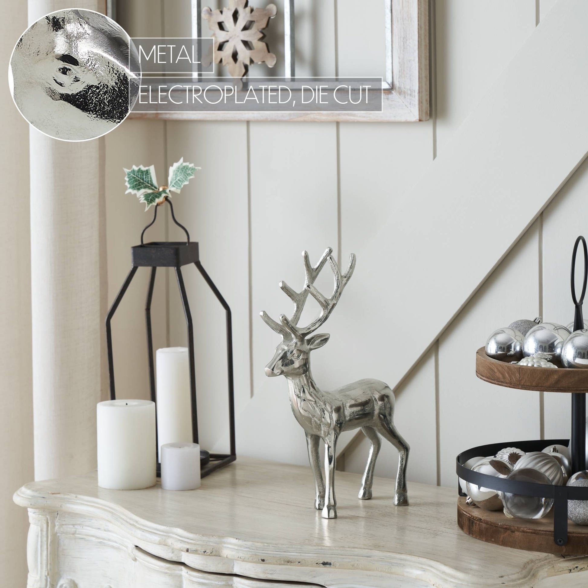 Add a gleaming touch of holiday elegance to your space with the VHC Brands Shiny Reindeer Figurine. Standing 8 x 12 inches, this tall, stately reindeer is crafted from metal and finished in a bright silver tone, bringing a modern sparkle to traditional Christmas decor. The textured detailing along its body enhances its silhouette, giving the piece depth and a handcrafted, rustic appeal. Electroplated for a polished, lasting shine, this figurine blends the warmth of primitive styling with a touch of contemporary flair. Whether featured alone or as part of a festive centerpiece, the reindeer adds height and sophistication to mantels, shelves, and holiday table displays. Its solid color finish and clean lines make it a versatile accent that complements both neutral palettes and vibrant seasonal themes. Designed to bring festive charm to any room-be it the bathroom, bedroom, dining room, entryway, kitchen, or living room-this decorative reindeer makes a graceful addition to your holiday home. Simply wipe clean with a damp cloth.