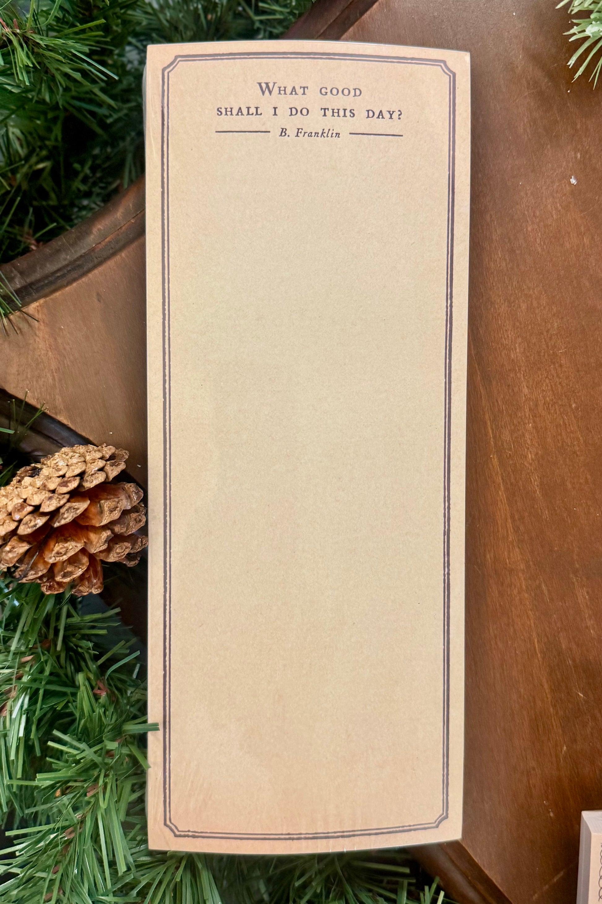 This unlined notepad will remind you, "What good shall I do this day?" - B. Franklin. Pages can easily be torn off and stuck to a fridge or tucked into a notebook or planner.